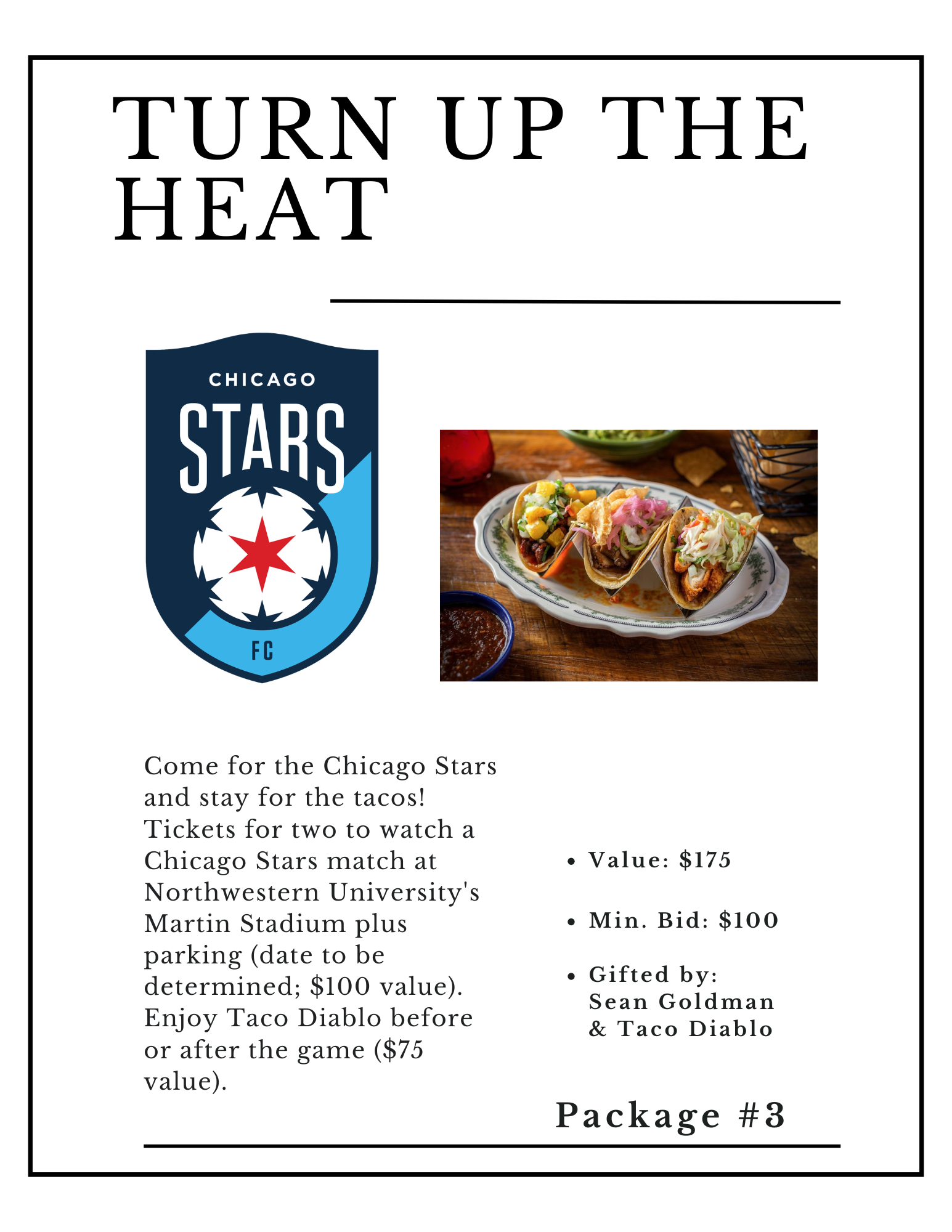 Come for the Chicago Stars and stay for the tacos! Tickets for two to watch a Chicago Stars match at Northwestern University's Martin Stadium plus parking (date to be determined; $100 value). Enjoy Taco Diablo before or after the game ($75 value).