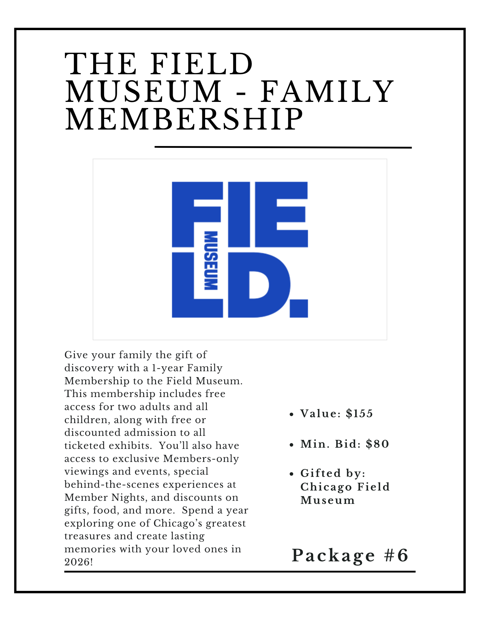 Give your family the gift of discovery with a 1-year Family Membership to the Field Museum. This membership includes free access for two adults and all children, along with free or discounted admission to all ticketed exhibits. You’ll also have access to exclusive Members-only viewings and events, special behind-the-scenes experiences at Member Nights, and discounts on gifts, food, and more. Spend a year exploring one of Chicago’s greatest treasures and create lasting memories with your loved ones in 2026!