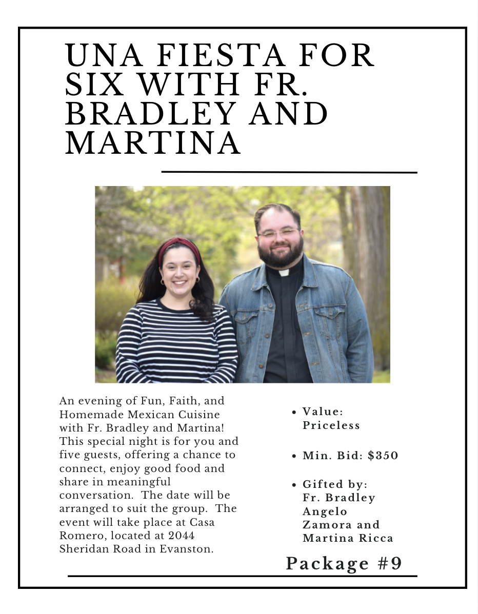For more details and to schedule your evening, contact Fr. Bradley Zamora at bradley.zamora@northwestern.edu or call 847-328-4648.