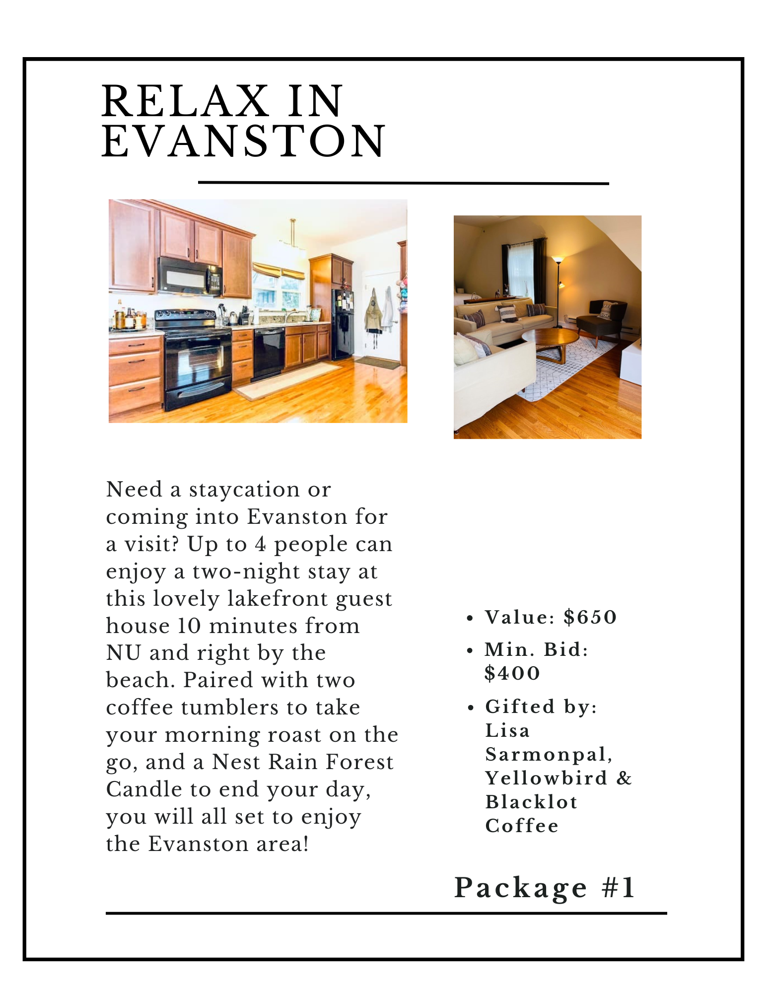 Need a staycation or coming into Evanston for a visit? Up to 4 people can enjoy a two-night stay at this lovely lakefront guest house 10 minutes from NU and right by the beach. Paired with two coffee tumblers to take your morning roast on the go, and a Nest Rain Forest Candle to end your day, you will all set to enjoy the Evanston area!