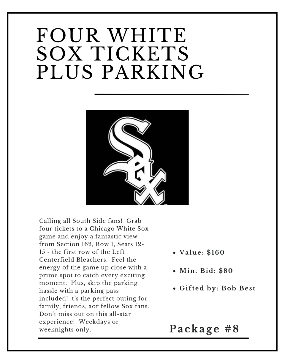 Calling all South Side fans! Grab four tickets to a Chicago White Sox game and enjoy a fantastic view from Section 162, Row 1, Seats 12-15—the first row of the Left Centerfield Bleachers. Feel the energy of the game up close with a prime spot to catch every exciting moment. Plus, skip the parking hassle with a parking pass included! It’s the perfect outing for family, friends, or fellow Sox fans. Don’t miss out on this all-star experience! Weekdays or weeknights only.