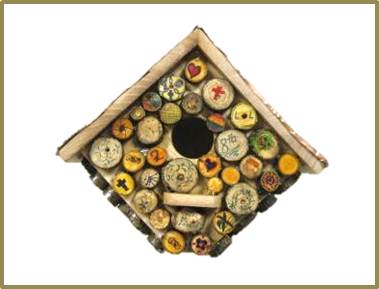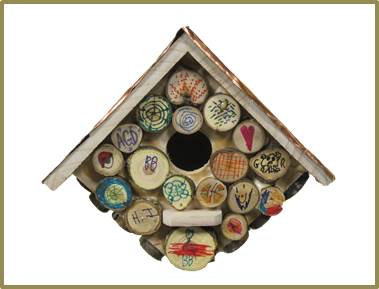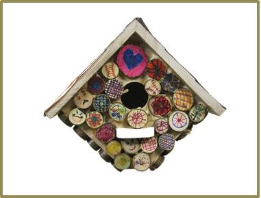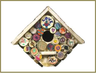 This sign-roofed, one-of-a-kind birdhouse, built and donated by a Sheil Associate, has been decorated by the hard work and vivid imagination of the sixth graders in the Sheil school of religion. It will lift your spirits, with or without birdsong.