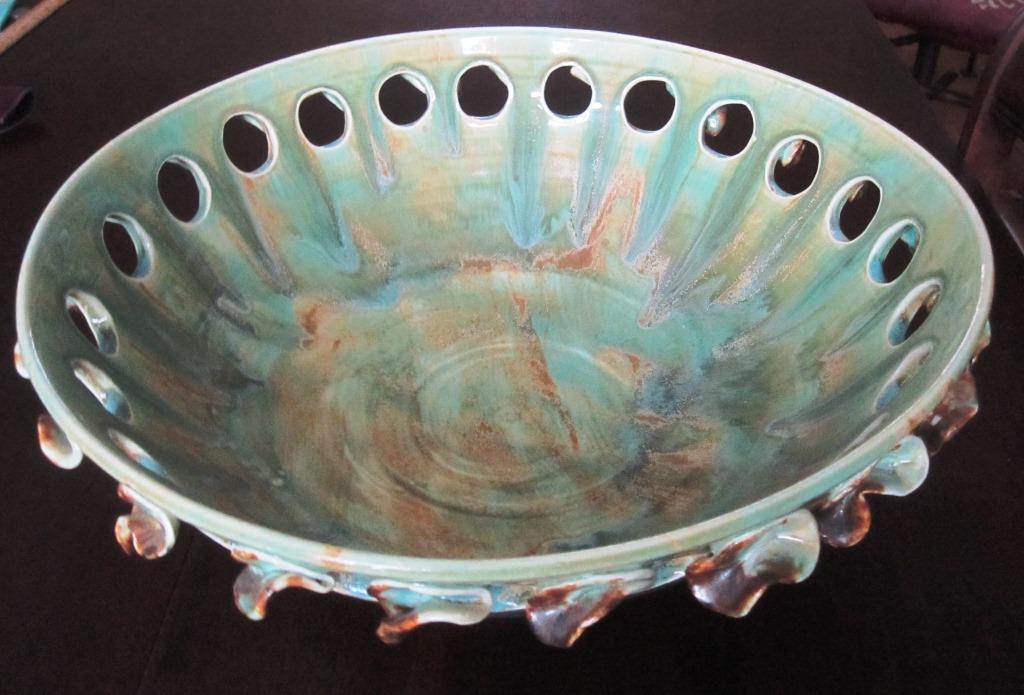 This stunning hand-made pottery bowl in swirled green and brown offers a striking addition to any room. 15.5" diameter by 5.5" high. Value approximate. Donor believes her parents paid $400 for this uniquely beautiful piece, but she just wants someone to enjoy it.