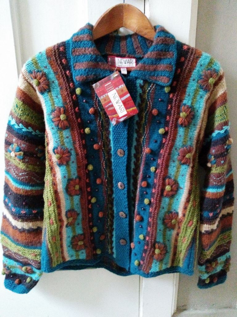 A colorful 100% wool woman's cardigan. Beautiful Icelandic design, hand-knit in Nepal by the women of Newar. Size S/M.