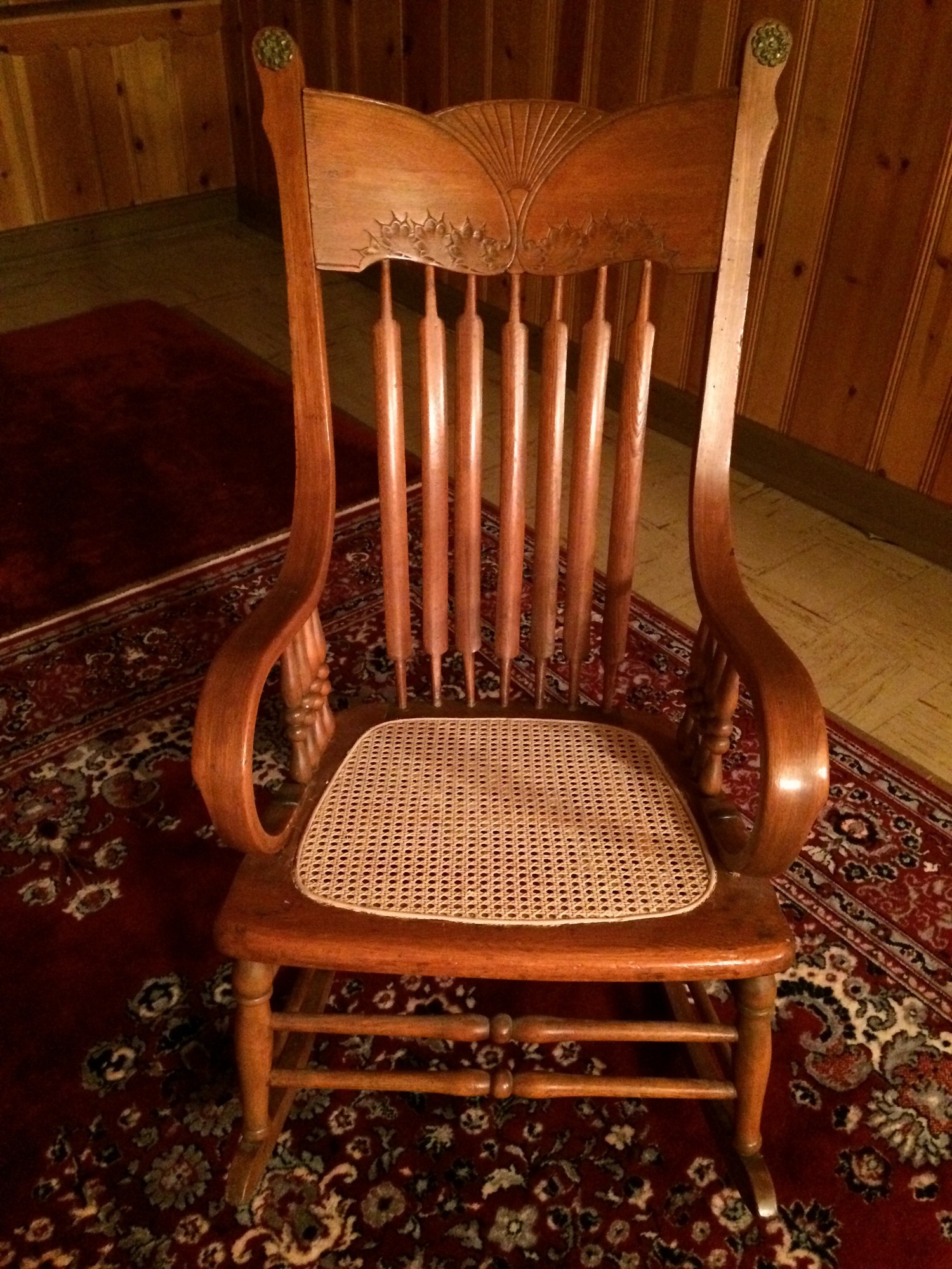 Rock away your blues with this antique rocking chair. Spindle-backed, with striking carving and detail. Chair seat re-caned two months ago. Rough dimensions: 40" high, rocker base 34", seat 20x22". Available for pick up, or delivery within 10 miles of Sheil. Value approximate.